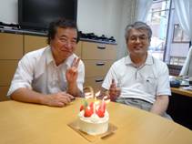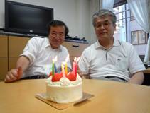 今日は坂本さんのお誕生日です。夕方から角倉KenさんがYukiさんと一緒にみえるということになり、それでは今月8日にお誕生日だったKenさんと一緒にお祝いをしましょうということになりました。年齢よりちょっとだけ多い分はろうそくを沈めて使うということで、ろうそくは6本。Kenさんにはちょっと足りなかったのですが、そんなことは意にも介さず、歌も歌わず、あっという間に食べてしまいました。
