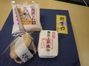 午後の暑い時間に、先日加入した生命保険の営業さんが書類変更のために珍しいお菓子と一緒にみえました。お土産に頂いたのは、餡がはみ出している「切腹最中」・「景気上昇最中」はモナカ?サイチュウ?、「出世の石段」の三種類の入った和菓子の詰め合わせでした。