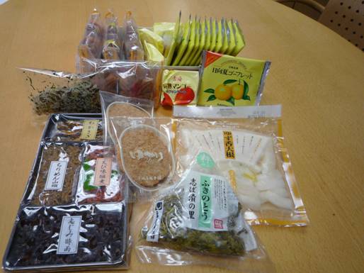 で、こんなに食べ物を頂きました。写真の中は、佃煮(わかさぎ・えび・シジミ・ちりめんの4種)・えびせん・漬物(ふきのとう・ゆず大根)・日向夏ゴーフレット・完熟マンゴーのシフォンケーキ・もみじまんじゅう・じゃこと広島菜のふりかけです。