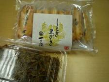 おかきの手前は小魚の佃煮。サスガ★さん、「おつまみに良いでしょう・・・」とこの会社の夕方の姿を良くご存知です。(HaS)