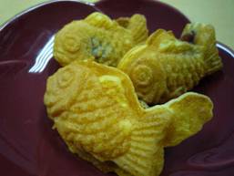 そして夕方、小さい魚達と一緒にハヤカワさんが顔を出してくれました。この中味はアンコ・クリーム・紫いもです。 ちょっと寂しかった丸テーブルの上が秋の果物とタイ焼きで賑やかになりました。 (HaS)