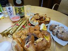 6時頃集合!ということで、丸テーブルと大きな四角い机を前方後円卓と称して並べ、飲み物、食べ物を準備して用意万端。あとは人が集まるだけ・・・と思っていましたが、来た方がそれぞれに美味しいものを手に現れたので、今までになく机の上が豪華になりました。何をどう並べましょうかなんて思っているうちに宴会はどんどん始まり、食べることに気を取られ・・・またもやこの豪華宴会の写真は1枚もないのです。