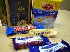 頂いたお土産はまだあります。バニラティー・ミルキー、Cadburyチョコの「Dairy Milk」「Fruit & Nut」「TimeOut」の詰め合わせ、「Toblerone」のチョコ。もう一つは「山うにとうふ」。これは豆腐の味噌漬けで「ウニのふりした、豆腐です」と箱にありました。