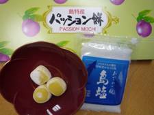 「原料は海水のみ」の島の塩と「パッション餅」です。パッションというくらいだから赤いお餅かな?と思って開けたらゆずのような色のあま〜いぎゅうひのお餅でした。