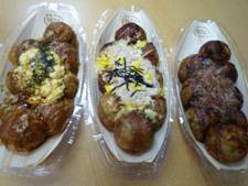 ついに「たこ焼き」の写真を撮りました。今までに何度も頂いているのに、包みをあけた瞬間からの魅力的な匂いに負けて、いつも気がつくのは食べたあと。今回は真ん中の「ツナとコーン」の新顔もありました。