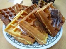 以前会社にいたMさんが産休に入ったので・・・とすいかのようなお腹と共に顔を出してくれました。お土産に頂いたのは「お米のワッフル」。「食べ物大好き心」はそのまま、2つの袋には全種類8つのワッフルが入っていました。皮はもっちりとしていて、真ん中にチョコや餡子、クリームが乗っていました。