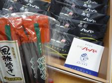 下の写真、手前の「風雅巻き」は大豆と醤油・醤油とピーナッツ・わさびと大豆等の海苔巻きです。その向こう側は横浜ありあけの「黒船ハーバー」、カステラ生地に栗餡が入っています。