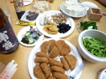 「ハナマサ」の枝豆・漬物・冷奴、いらした方は塩らっきょう・黒豆・鰯のマリネ・メンチカツ・蓮根のきんぴら等々美味しい物を調達して下さって、賑やかな丸テーブルになりました。(HaS)