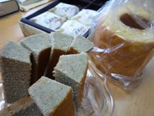 手前のニューフェースのバームクーヘン、見たところ紅茶か抹茶入りのような色ですが、何が入っているかわからないとのこと。それは食べればすぐにわかる・・・と勇んで食べてみましたが、やはり???でした。ちょっと香りがするので、「シナモン入りでは?」とおっしゃるお客様もありましたが、謎のまま減っていきます。(HaS)