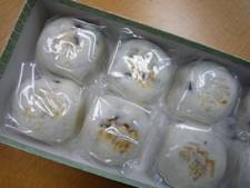 「あ〜しがらや〜まの金太郎♪」のお饅頭。薄皮の中は粒餡です。包み紙に「まさかり」の絵があり、お団子には山と「公時」の刻印がついていました。「金太郎」は坂田公時さんの愛称とのこと。